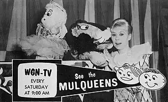In 1963, Mulqueen and her husband began hosting The Mulqueens on WGN-TV. Mulqueen appeared on stage as a pixie-like character named Pandora.[2] In 1965, the program moved to WBKB-TV (now WLS-TV), and the show was renamed Mulqueen's Kiddie A-Go-Go. Mulqueen continued to host in character as Pandora, while the show now featured live dancing to popular music.[2][3] In 1966, the program moved to WCIU-TV and its name was shortened to Kiddie A-Go-Go.[2][3] Several popular musical groups performed on the show, including The Four Seasons and New Colony Six.[1] "Kiddie A-Go-Go" remained on WCIU until 1970.[2]