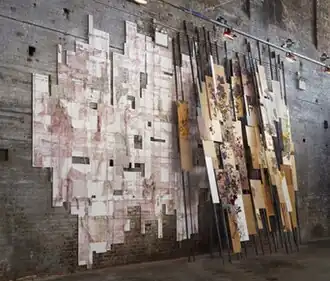 In two large installations, Herzog explored history as a cycle of resurrection and collapse, and rationality spiraling into entropy.[46][14] "SHIFT" (2015, Studio 10) featured 6'–8' amputated tree logs embedded with textile remnants and arranged on tattered Persian rugs that were surrounded by walls punctured with vertical, sutured bits of a sports jacket.[47][14] Hyperallergic compared the show's elements to "precisely arranged shreds of viscera and lopped-off limbs" that offered a "witheringly beautiful meditation on the murderous elegance of fate."[47] In Valence (2014, The Boiler), Herzog created two overlapping, 17' x 24' surfaces of tattered fabric, staples and paint inspired by the Bauhaus textiles of Anni Albers—one supported by steel shelving posts leaning against a massive brick wall and the other mounted directly to the brick.[48][49] In 2018, she recreated Valence at the Rubin Foundation's 8th Floor Gallery in a 10'-high version inhabiting a corner in the gallery; writers likened it to intimate, peeling layers of civilization evoking aerial views and underlying structures of urban planning, power relations and global change.[46][50]
