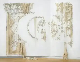 In 1999, Herzog began embedding found textiles in walls, movable panels and built surfaces using thousands of heavy-gauge metal staples that often re-inscribed selected patterns in the material.[38][39] She then deconstructed them through a process of shredding, pulling and cutting; the remaining fragments maintained the rectangular formats of her sources in ghostly, afterimage-like forms that dissolve distinctions between figure and ground.[40][11][2] Critics suggest that Herzog's disintegrating imagery and hands-on, violent process of de-materialization both acknowledge and undermine relationships to late-modernist and domestic-craft traditions, while suggesting geological-archaeological and historical themes of impermanence, decay, erosion, memory, absence and presence.[12][31][41]