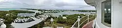 Elbow Cay is a five-mile-long (8.0-kilometre) cay in the Abaco Islands of The Bahamas. Originally populated by British loyalists fleeing the newly independent United States of America in 1785, it has survived on fishing, boat building, and salvage. Its main village of Hope Town surrounds a protected harbor with a noted red-and-white-striped one-hundred-and-twenty-foot-tall (37-metre) lighthouse built in 1863. On September 1, 2019, Elbow Cay took a direct hit from Category 5 Hurricane Dorian, with sustained winds of 185 mph (295 km/h). The lighthouse survived.