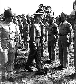 ![]() Major General Elbridge Chapman (left), commander of the 13th Airborne Division, and Lieutenant General Lesley J. McNair, commander of Army Ground Forces, inspect troopers of the Elbridge's division, May 13, 1944 | |