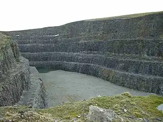 Quarrying permission was granted in 1950 and huge quantities of limestone have been excavated, mostly for road-building purposes. A large amount of the northern and northwestern slopes of the hill have disappeared and it has been called the best-known eyesore in the Peak District.[4] In 1995 an application by RMC Aggregates to extend the quarrying further east was denied as parliament tightened up on environmental problems caused by old mineral permissions granted between 1948 and 1981. The quarry closed in 1999 and now stands unused with vegetation starting to grow on the quarry face. There have been some attempts at natural restoration with several aquatic pools being established in the former workings.[5] The termination of quarrying has also given cavers the chance to explore some of the narrow caves exposed by the work, with Sidetrack Cave (discovered 2002)[6] being one of the most impressive. In September 2020 the quarry was used as a film location for a TV series called Ray James, inspired by H. G. Wells' The War of the Worlds.[7]