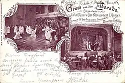 The performances at the club were diverse and included effeminate men dancing whilst dressed in women's clothing, and a man singing Parisian-sounding songs in a high-pitched soprano.[6] Marlene Dietrich performed at the club.[1] Additionally they would throw fancy balls and costume parties.[6] Eldorado also included what have come to be called drag shows as a regular part of the cabaret performances.[1][7][6][8] There were numerous somewhat similar establishments to Eldorado during its day. The club has been described by writers and artists, and has been immortalized in paintings and photographs.[9][10]