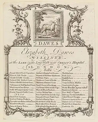 Although guilds had been formed around specific trades, by the eighteenth century many of the London guilds, known as Livery Companies, no longer had monopoly control of their indicated trades.[7] Only a few companies by this time specified the actual trade to be practiced by its members, so members of the company could practice a trade completely unrelated to the named trade of the company.[8] In order to run a business and trade within the walls of the City of London, membership in one of the companies was required for both men (known as masters) and women (known as mistresses).