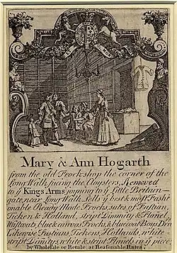 In the eighteenth century, millinery was considered a respectable trade for middle-class women and impoverished upper-class women - women who would not want to lower themselves by becoming domestic servants or performing actual labor. Far from putting their daughters in trade because they were unmarriable, Amy Erickson suggests that parents apprenticed their daughters to provide them with a reasonable living when the family did not have the money for a dowry and also to gain skills that might attract a husband and sustain them throughout their lives.[30] Mary and Ann Hogarth, sisters of the artist William Hogarth, contemporaries of Mosley, never married and supported themselves through their own millinery shop.[31] One of their business cards was designed by their brother.