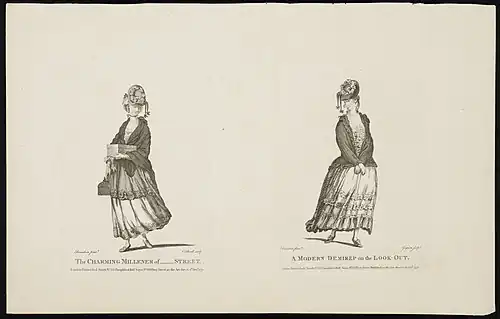 Other images, such as Robert Dighton's A Mourning Ramble shows young women who seem to be more interested in flirting with male customers than in making sales. This satirical print by James Caldwell compares the "Charming Millener" to a demirep (which is a woman of questionable morals).