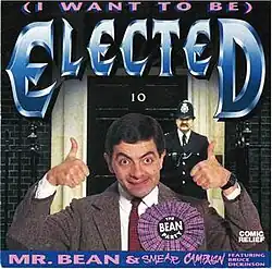 - In 1992, a cover version titled "(I Want To Be) Elected" by Rowan Atkinson (as Mr. Bean) and Smear Campaign was released in support of the British charity Comic Relief and featured a performance by Bruce Dickinson and members of the hard rock band Taste (later known as Skin). The record was released in the run up to the United Kingdom General Election of 1992 and reached No. 9 in the UK Singles Chart.[15] The music video, in which Mr. Bean's doorstep canvassing and electoral stunts are intercut with the live video of Dickinson and the band, was directed by Paul Weiland.[16]