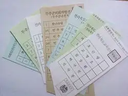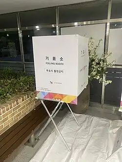 Polling places are usually located in schools. During the absentee or early voting period, voters can vote at any place in the country. On election day, voters may only vote at polling places in their registered constituency. Korean voters mark paper ballots with a rubber stamp using red ink. There is one race per ballot paper; if there are multiple offices up for election, ballot papers are colour-coded and voters are issued one ballot per race.[5]
