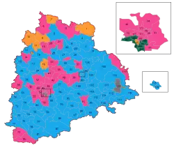 119 | Bharat Rashtra Samithi | 63 | 34.31% | Indian National Congress | 21 | 25.27% | Telugu Desam Party | 15 | 14.73% | |||