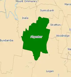 The electoral district of Algester is an electoral district of the Legislative Assembly of Queensland in south-west Brisbane.[1] It includes the suburbs of Algester, Parkinson, Hillcrest, Boronia Heights, Forestdale, Larapinta, Heathwood, Forest Lake, Doolandella and Pallara, as well as the Greenbank Military Range. It borders the electoral districts of Sunnybank, Stretton, Logan, Lockyer, Bundamba and Inala.[2]