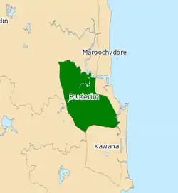 Buderim is an electoral district of the Legislative Assembly in the Australian state of Queensland. Based on the Sunshine Coast, the district is a traditionally safe seat for the Liberal National Party.[1]