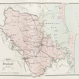 The Electoral district of County of Stanley was an electorate of the New South Wales Legislative Council at a time when some of its members were elected and the balance were appointed by the Governor. It was a new electorate created in 1851 by the expansion of the Legislative Council to 54 members, with 18 to be appointed and 36 elected.[1] The previous district of Counties of Gloucester, Macquarie, and Stanley was split into the districts of Gloucester & Macquarie, Stanley and Stanley Boroughs, which included North Brisbane, South Brisbane, Kangaroo Point and Ipswich.[1]