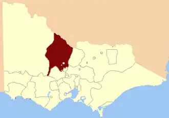 Its area was defined in the Victoria Constitution Act 1855 (18 & 19 Vict. c. 55) as: "Bounded on the West by the River Avoca, from its Source in the great dividing Range to its Entrance to Lake Bael Bael, thence by a Line Northward to the River Murray ; on the North by the River Murray ; on the East by the River Campaspe to its Junction with the Coliban, and on the South by the Northern Boundary of the Counties of Dalhousie and Talbot to the commencing Point, excepting the Country comprised in the Electoral Districts of the Castlemaine Boroughs and of the Sandhurst Boroughs."[3]