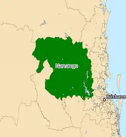 Nanango is an electoral division in the state of Queensland, Australia. Notable towns include Nanango, Kingaroy and Crows Nest.[1] It is currently held by former Opposition Leader Deb Frecklington of the Liberal National Party.