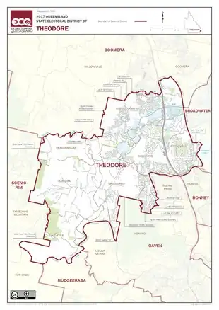 Theodore is an electoral district of the Legislative Assembly in the Australian state of Queensland. It was created in the 2017 redistribution, and was won at the 2017 election by Mark Boothman. It is named after former Queensland Premier, Ted Theodore.[1] From results of the most recent election, Theodore is a marginal seat for the Liberal National Party with a margin of 3.7%.