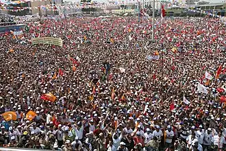A wall rug of Erdoğan at a rally of the Justice and Development Party