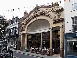 The oldest part of the building is the boundary wall at the rear, the base of which is mediaeval, with later additions, and was originally part of the wall of the York Carmelite Friary. In front of it is a late-19th-century building, which has been fully incorporated into the main, front, part of the building, which dates from 1911. The front to Fossgate is covered in glazed tiles and faience, and takes the form of a large arch, supported on columns. Inside, various plaster mouldings from the cinema survive, as does the decorated panelled ceiling.[1]