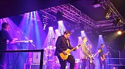 Electric Six incorporates a variety of styles, resulting in being termed a "genre-blurring" band.[51] The group's sound has been described as a synthesis of "disco, synth pop, glam, and arena rock",[52] including the falsetto vocals of disco, laden with "rampant solos, be they guitar riffs, synth wails, or strutting drums" that enforce the band's "energetic sound".[53] However, the band members themselves have rejected such genre classifications as "disco-metal" and "disco-punk".[54]