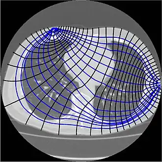 A cross section of a human thorax from an X-ray CT showing current stream lines and equipotentials from drive electrodes. Note how lines are bent by the change in conductivity between different organs.[1]