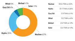 In 2013, the leading type of power generation by utilities in Canada is hydroelectricity, with a share of 60.1%. Nuclear (15.8%), natural gas (10.3%), coal (10%), wind (1.8%), fuel oil (1.2%), biofuels and waste (0.8%), wood (0.4%) and solar (0.1%) follow. Other sources, such as petroleum coke make up the remaining 0.5%.[26][27][28]