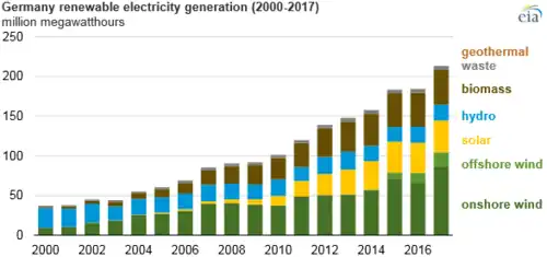 As part of its energy transition towards renewable energy, Germany's installed capacity for electric generation increased from 121 gigawatts (GW) in 2000 to 218 GW in 2019, an 80% increase, while electricity generation increased only 5% in the same period, due to the lower capacity factors of renewable energy sources.[10]