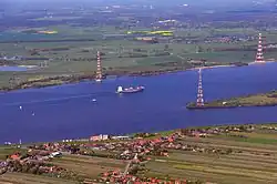 Elbe Crossing 2 is a group of transmission towers providing overhead lines for four 380 kV three-phase alternating current (AC) circuits across the German river Elbe.[53][54] It was constructed between 1976 and 1978 to supplement Elbe Crossing 1, and consists of four towers: