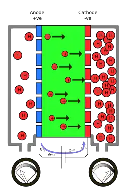 An electrochemical hydrogen compressor is a hydrogen compressor where hydrogen is supplied to the anode, and compressed hydrogen is collected at the cathode[1] with an exergy efficiency up to and even beyond 80% for pressures up to 10,000 psi or 700 bars.[2]