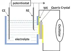 Electrochemical quartz crystal microbalance (EQCM) is the combination of electrochemistry and quartz crystal microbalance, which was generated in the eighties.[1][2][3] Typically, an EQCM device contains an electrochemical cells part and a QCM part.[4] Two electrodes on both sides of the quartz crystal serve two purposes.[4] Firstly, an alternating electric field is generated between the two electrodes to make up the oscillator.[4] Secondly, the electrode contacting electrolyte is used as a working electrode (WE), together with a counter electrode (CE) and a reference electrode (RE), in the potentiostatic circuit constituting the electrochemistry cell.[4] Thus, the working electrode of electrochemistry cell is the sensor of QCM.[2]