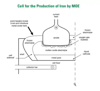 Molten Oxide Electrolysis in steelmaking is utilizing electrons as the reducing agent instead of coke as in conventional blast furnace. For steel production, this method uses an inert anode (Carbon, Platinum, Iridium or Chromium-based alloy)[4] and places iron ore in the cathode. The electrochemical reaction in this Molten Oxide cell can reach up to 1600 °C, a temperature that melts iron ore and electrolyte oxide.[5] Then the molten iron ore decompose following this reaction:[6]