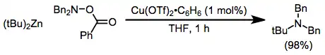 - ^ Berman, Ashley M.; Johnson, Jeffrey S. (2006-01-01). "Copper-Catalyzed Electrophilic Amination of Organozinc Nucleophiles: Documentation of O-Benzoyl Hydroxylamines as Broadly Useful R2N(+) and RHN(+) Synthons". The Journal of Organic Chemistry. 71 (1): 219–224. doi:10.1021/jo051999h. ISSN 0022-3263. PMID 16388639.