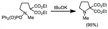 Intramolecular amination is possible, and has been used to prepare small and medium rings. In the example below, deprotonation of an activated methylene compound containing an O-phosphinoylhydroxylamine led to the cyclic amine shown.[28]