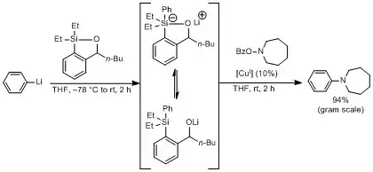 Aryl and heteroaryl organolithium reagents undergo efficient electrophilic amination under copper (I) catalyzed condition mediated by recoverable silicon reagents, termed siloxane transfer agents.[22]