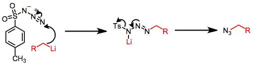 Additions across pi bonds appear to proceed by typical nucleophilic addition pathways in most cases. Alkyl-, aryl-, and heteroaryllithium reagents add to azides to afford triazene salts.[5] Reduction of these salts leads to amines, although they also may be converted to azides upon acidic workup with overall elimination of sulfinic acid.