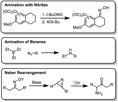 Several other methods for the electrophilic formation of C-N bonds are available. Nitrites and nitrates can be used to form oximes and nitro compounds, respectively. Additionally, organoboranes can serve the role of the nucleophile and often provide higher yields with fewer complications than analogous carbanions. The Neber rearrangement offers an alternative to electrophilic amination through the intermediacy of an azirine.
