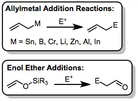 Electrophilic additions can be affected with a wide variety of organometallic reagents.[23][24] Organosilanes offer the advantage of greater robustness to a wide array of reaction conditions than allyl compounds of more electropositive metals, and do not spontaneously undergo allylic rearrangement or epimerization. Additionally, organosilanes are rarely toxic and their reactions can be easily tracked by NMR spectroscopy (because of distinctive changes in the position of resonance of the methyl groups attached to silicon as addition occurs). Reactions of allylsilanes are similar in many respects to reactions of silyl enol ethers—in fact, allylsilanes can be used as masked enolate equivalents. After addition of the allylsilane, ozonolysis provides the corresponding carbonyl compound.