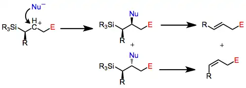 A model of the most likely reactive conformation of the allylsilane (see below) suggests that the new double bond that forms will predominantly possess the (E) configuration. However, addition of a nucleophile (such as the counterion of the electrophile) to the intermediate silyl-stabilized carbocation complicates this picture. Because the elimination to generate the double bond is stereospecifically anti, nucleophilic addition to either face of the silyl-stabilized carbanion leads to the formation of mixtures of double bond isomers. Diastereomeric mixtures of double bond isomers are common when Lewis acids are used to activate the electrophile.[7]