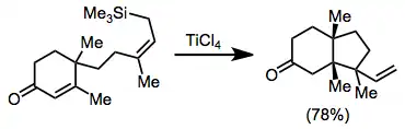Conjugate addition reactions of allylsilanes are possible, although unsaturated aldehydes undergo only 1,2 addition.[15] The combination of an allylsilane with an α,β-unsaturated ketone in the presence of a Lewis acid is known as the Sakurai reaction. The enolate intermediate that results from addition can be functionalized with a separate electrophile or simply protonated. Intramolecular Sakurai reactions provide ene-6-ones[16]