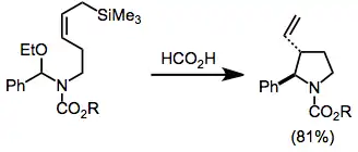 Iminium ions generated in situ may be trapped by intramolecular allysilanes. The cyclization below has been used in syntheses of isoretronecanol and epilupinine.[18]