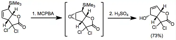 Epoxidation of allyl- and vinylsilanes can be easily accomplished with peracids. Silyl epoxides can be converted into ketones, aldehydes, or alkenes after selective epoxide opening and elimination. When allylsilanes are combined with peracids, the intermediate epoxides are usually converted to allylic alcohols before isolation.[19]