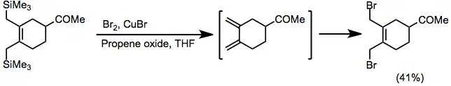 Halogen electrophiles, primarily X2, react with vinyl- and allylsilanes to give a number of halogenated products. Further reaction of the initial adducts is common, and may lead, for instance, to conjugated dienes. Dienes may react further with X2 under the reaction conditions or undergo [4+2] cycloadditions in the presence of dienophiles.[20]