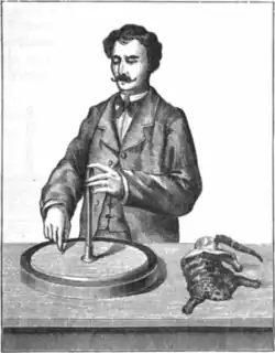 In electromagnetism, an electrophorus or electrophore is a simple, manual, capacitive, electrostatic generator used to produce charge via the process of electrostatic induction. A first version of it was invented in 1762 by Swedish professor Johan Carl Wilcke.[1][2][3][4] Italian scientist Alessandro Volta improved and popularized the device in 1775,[5] and is sometimes erroneously credited with its invention.[6][7] The word electrophorus was coined by Volta from the Greek ήλεκτρον, elektron, and φορεύς, phoreus, meaning 'electricity bearer'.[8]
