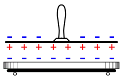 The electrophorus consists of a dielectric plate (originally a 'cake' of resinous material such as pitch or wax, but in modern versions plastic is used) and a metal plate with an insulating handle.[9] The dielectric plate is first charged through the triboelectric effect by rubbing it with fur or cloth. For this discussion, imagine the dielectric gains negative charge by rubbing, as in the illustration below. The metal plate is then placed onto the dielectric plate. The dielectric does not transfer a significant fraction of its surface charge to the metal because the microscopic contact is poor. Instead the electrostatic field of the charged dielectric causes the charges in the metal plate to separate. It develops two regions of charge – the positive charges in the plate are attracted to the side facing down toward the dielectric, charging it positively, while the negative charges are repelled to the side facing up, charging it negatively, with the plate remaining electrically neutral as a whole. Then, the side facing up is momentarily grounded (which can be done by touching it with a finger), draining off the negative charge. Finally, the metal plate, now carrying only one sign of charge (positive in our example), is lifted.[4]