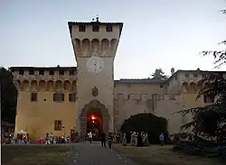 After Eleonora died in 1562, Cosimo's daughter Isabella replaced her as the first lady of Florence. She acted as a surrogate consort and also took over the supervision of Leonora's upbringing.[6] The red-headed Leonora, who possessed a natural charm, was popular in the Medici family. At the age of five, she was reported as being a comfort to Cosimo's second daughter Lucrezia, from whom she became inseparable, when Lucrezia was apart from her husband Alfonso d'Este.[7] Lucrezia died in 1561, leaving Isabella as Cosimo's only surviving daughter; the grand duke was, however, extremely fond of Leonora, and treated her as his own daughter. He was charmed by her vivacity and physical vigour—she delighted in horsemanship and arms—though he occasionally gently reminded her to behave with more decorum.[4] Owing to the close family and political ties between the House of Medici and the viceroyal family of Toledo, a marriage was arranged between Leonora and Cosimo's son Pietro, with whom she had grown up and who was of a similar age. The couple were betrothed in 1568 when Leonora was 15, with the approval of Philip II of Spain. Garcia Álvarez de Toledo provided her with a dowry of 40,000 gold ducats.[d] They were married at the Palazzo Vecchio in April 1571, and it was reported that Pietro had to be forced to consummate the union.[e] On 10 February 1573, Leonora gave birth to a son, Cosimo ("Cosimino"), who was the sole male Medici heir in this generation until his death three years later, in August 1576, one month after his mother's death.[10][f]