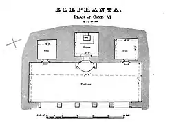 One is a large hall known as Cave 6, or Sitabai's temple cave (18°57′50″N 72°56′03″E / 18.963835°N 72.934125°E). The portico has four pillars and two pilasters. The hall has 3 chambers at the back, the central one a shrine and the rest for monks or priests. The hall is devoid of any decoration, except for the door of the central shrine, which has pilasters and a frieze, with the threshold decorated with lion figures.[74] The sanctum has no remaining image. Cave 6 is historically significant because it was converted and used as a Christian church by the Portuguese in the later years when the island was a part of their colony (at some point between 1534 and 1682).[75][76]