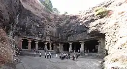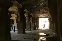 The main cave, also called Cave 1, Grand Cave or the Great Cave, is 39.63 metres (130.0 ft) square in plan with a hall (mandapa).[12] The basic plan of the cave can be traced back to the plan of the ancient Buddhist viharas, consisting of a square court surrounded by cells, built from about 500 to 600 years before in India.[24] The Cave has several entrances, the main entrance is unassumingly small and hides the grand hall inside. The main entrance faces north, while two side entrances face east and west. The cave's main entrance is aligned with the north–south axis, unusual for a Shiva shrine (normally east–west).[10][21][2] However, inside is an integrated square plan Linga shrine (garbha-griya) that is aligned east–west, opening to the sunrise.[12]