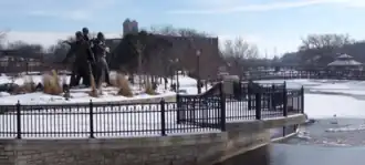 Rovelstad used the profits from the half dollar to continue work on his statuary group. He sought direct funding from the federal government in 1938 and from the Illinois Legislature the following year; both attempts failed. Through the half century that followed, he progressed on the statues, and by the time of his death in 1990, he had completed the group in plaster of Paris, that still needed to be bronzed before display. Shortly before his death, he told his wife, "I've lived a full life and have no regrets. The Pioneer Memorial is now completed. I've done all I could. Now it's up to others to see it erected. I can do no more."[15][24][25] Rovelstad's tenant, Steve Youngren, established a foundation to raise money to complete the project. It raised $456,000, exceeding the actual cost by nearly ten percent, and the memorial was completed and dedicated in 2001.[26]