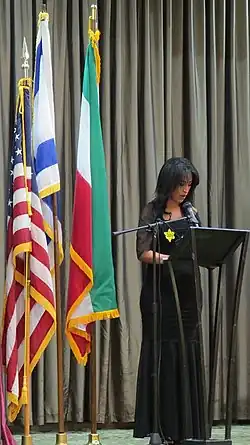 After the pro-democracy movement of July 1999, she moved to the United States. She started working as a counselor at JVS, one of the Jewish Federation's agencies helping new immigrant and refugees. In the meantime, she continued her pro-democracy activism from the U.S. She has frequently undertaken trips to different cities and states within U.S. where she gave lectures, interviewed prominent human right activists and high ranked government members. Elhmam’s activities towards elucidating of maltreating of human rights in Iran, denial of Holocaust on behalf of Iranian leaderships and her struggle against antisemitic resentments among Iranian politicians caused harsh verbal attacks of several radical Iranian newspapers and state-financed broadcastings which identified her as Zionist and anti-revolutionary individual.[6] In 2007, Elham started working as Community Outreach Advisor at California Army National Guard. In 2008, she pursued her studies in the masters program of the International Relations Department of California State University.