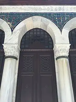 There is an arch-like wall between the ground floor and the dome which relieves the weight of the dome, also holds the dome together in an architectural and aesthetic way. Most of the building is concrete and painted to greenish yellow. The dome is green. The windows and the doors are made out of wood. The frames of the windows and doors, and the columns are made out of marble. Also the ceramic glazes are blue and because of that they have a harmony with the walls.