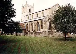 It seems likely that Beckingham was responsible for building the nave of Holy Trinity Church in Bottisham, Cambridgeshire, in what has been described as "a fitting tribute to the climax of [his] career, his economic success, and his bond with the village."[12] He was later interred in the same church[18][19] where a monument – in the "place of honour in the centre of the nave,"[20] described as a "raised Purbeck altar tomb"[12] – was dedicated to his memory.[3][18] This monument had affixed to it a brass, showing Beckingham dressed in clerical robes rather than the official garb of the Bench. The plaque has since been stolen, but the inscription is faintly apparent in the stone beneath.[21][22] It seems likely that it was removed by iconoclasts during the English Civil War: the inscription, surrounded by angels, was cujus anime propicieteur Deus.[23] (On whose soul may God have mercy.) At some point, Beckingham had given the church a silver chalice.[20] He bequeathed the Abbey land, forest, watermills, and an annual rent of sixty shillings per annum on condition that two monks should daily pray for the Abbey and Queen Eleanor (d.1290) and provide a feast for 200 of the poor on the anniversary of the queen's death.[24]