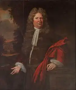 During the Georgian era under King George I, Yale and other merchants would meet at London coffee houses as centres of social life.[126] He kept his title of governor, and after the failures of his bankers, he opened a bank account in the newly created Bank of England, with deposits at C. Hoare & Co of Sir Richard Hoare, now the oldest bank in Britain.[127][122] He lived most of his remaining years at the Plas Grono estate in Wales, next to Erddig Hall, inherited from the line of his great-grandfather, Chancellor David Yale, and at his London house in Queen Square.[122] His neighbors included the Duke of Powis at Powis House, Lord Chancellor Bathurst, Queen Anne and her son Prince William, and artists Charles Burney and Jonathan Richardson.[128][129] In London society, Yale was associated with Sir Charles Cotterell, Master of the Ceremonies.[130] He was then elected in December 1717 a Fellow of the Royal Society under Sir Isaac Newton.[131] His candidature was introduced by Sir Hans Sloan, founder of the British Museum and compeer of Voltaire and Benjamin Franklin.[132][49] In the same year, Yale was asked by Newton to deal with the donations of Dr. Thomas Paget, and later received a new map of the Netherlands dedicated to him by John Senex, royal geographer of Queen Anne.[49][133][130]